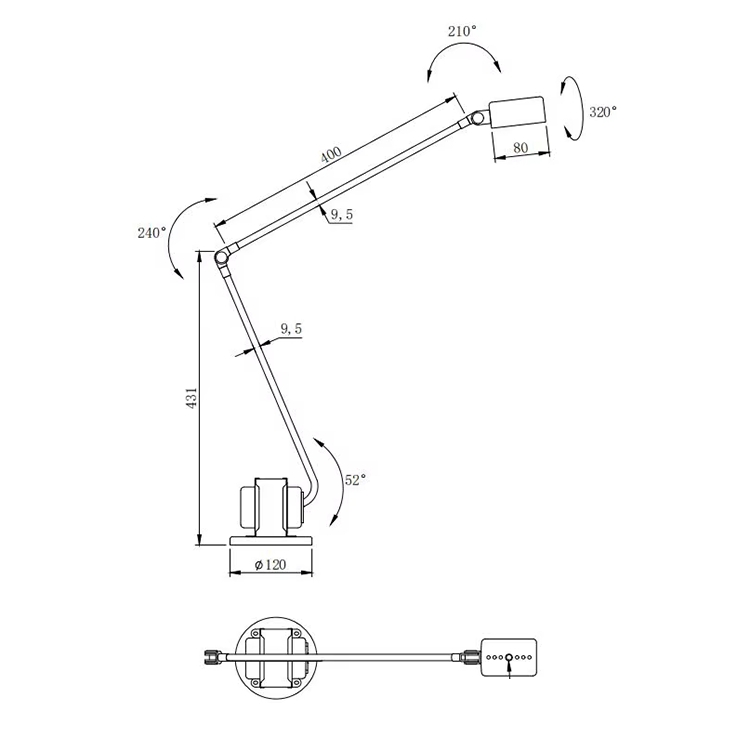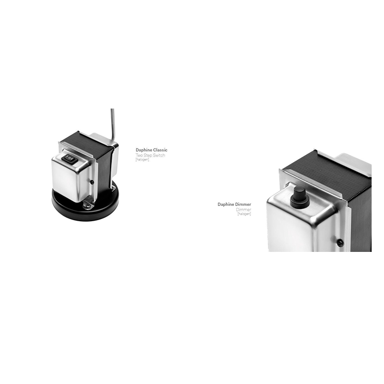 With a thin hinged arm, a small adjustable diffuser and the visible transformer on the base. • Head: Aluminum, Base: Metal • Color: Black,Brushed Nickel,Chrome, Matallic Bronze,Matt White, Red, Yellow,Cyan, Orange • Voltage: 100-240V • LED 11W Dimming Two Step Switch • IP-class: IP20 Class 2 Size:L660*W210*H431mm