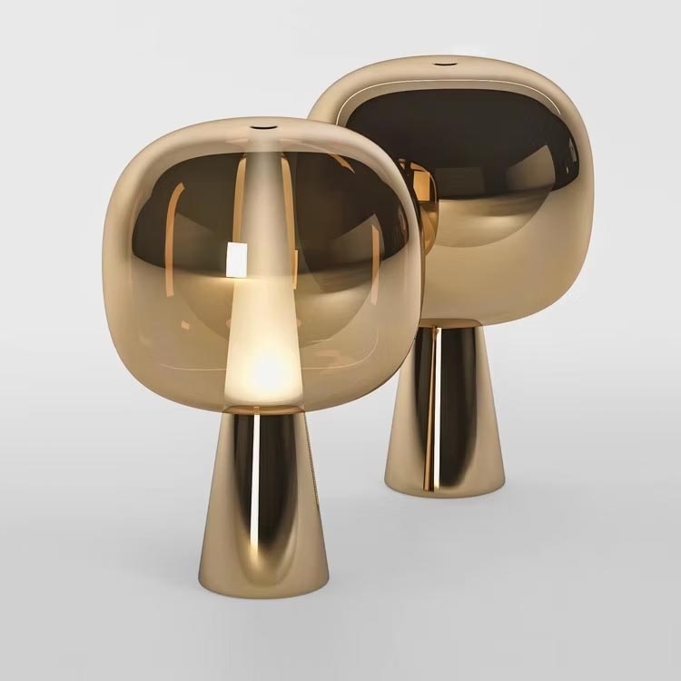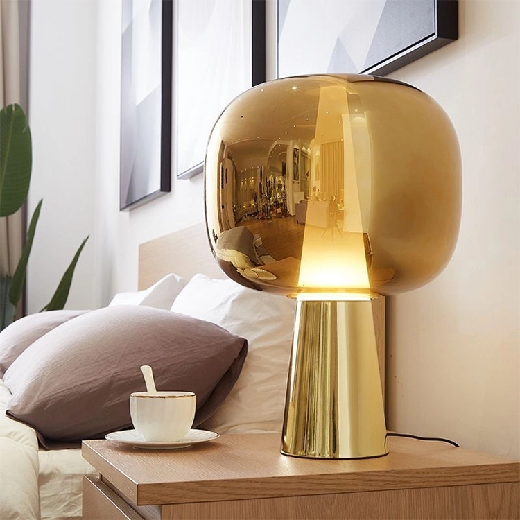 Dusk Dawn Brass, Metaled Glass Table Lamp • Color: Rose Gold ,Gold , Black , Silver • Replaceable LED module • Voltage: 100-240V • Power: Max 21W Size: D350*H500mm
